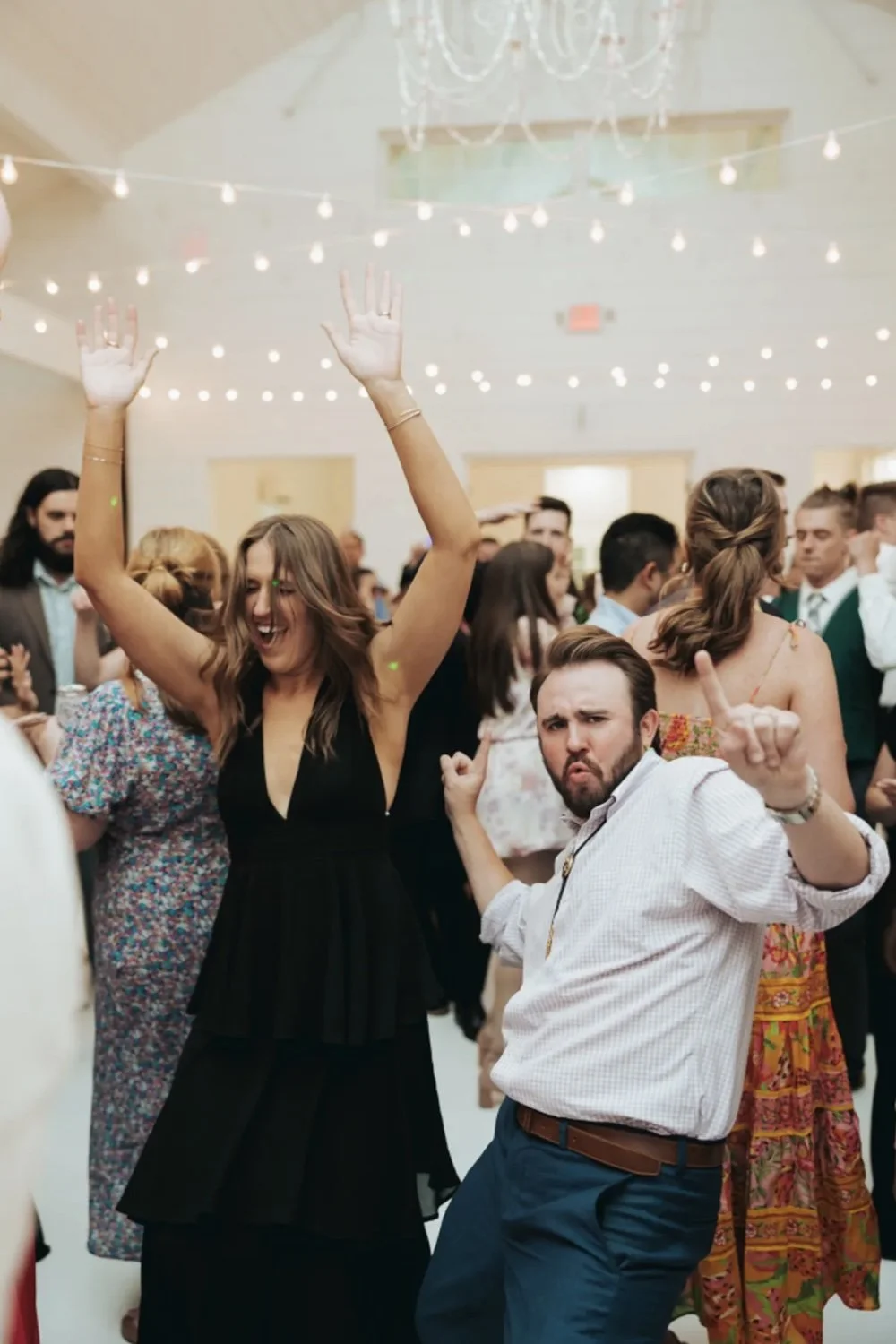 • A wedding reception with guests dancing and celebrating indoors under string lights and a chandelier.