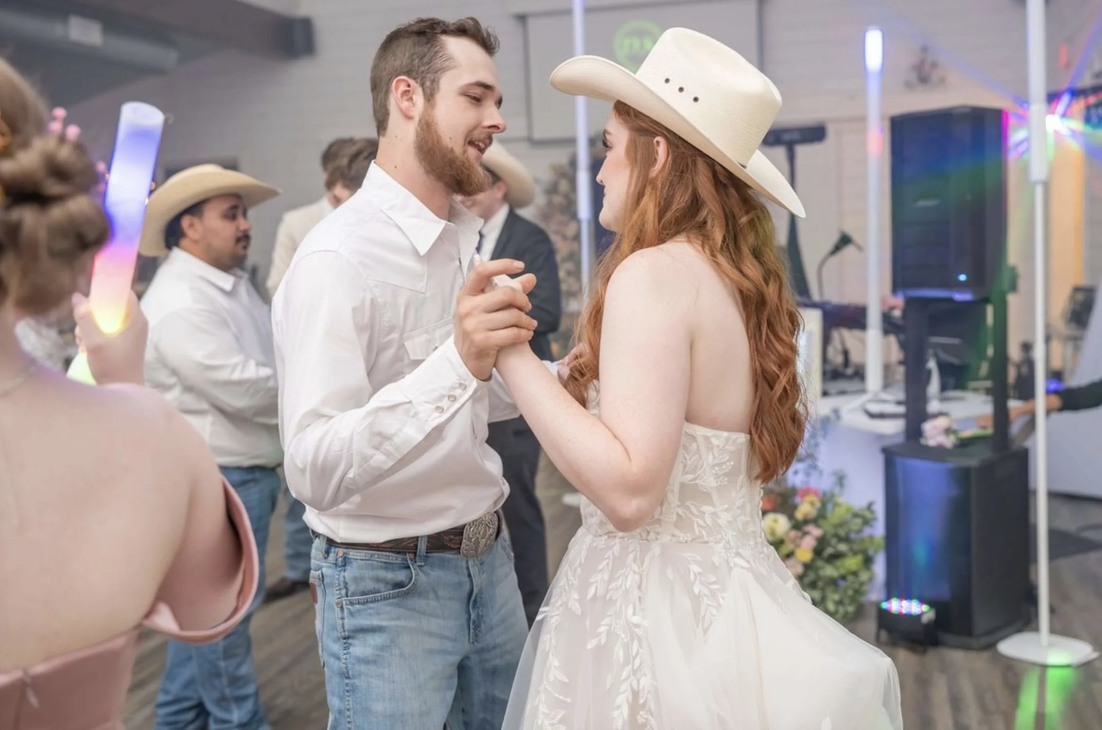 • A young couple dancing at a wedding reception, with the man in a white shirt and jeans and the woman in a strapless white wedding dress and wide-brimmed hat, surrounded by other guests.