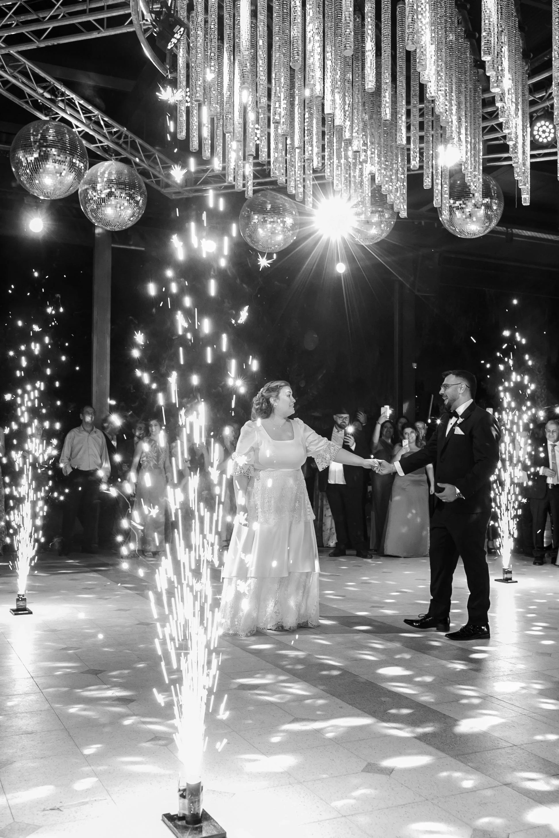 • A wedding reception with a bride and groom dancing under hanging disco balls and chandelier lights, surrounded by guests, with sparklers on the floor.