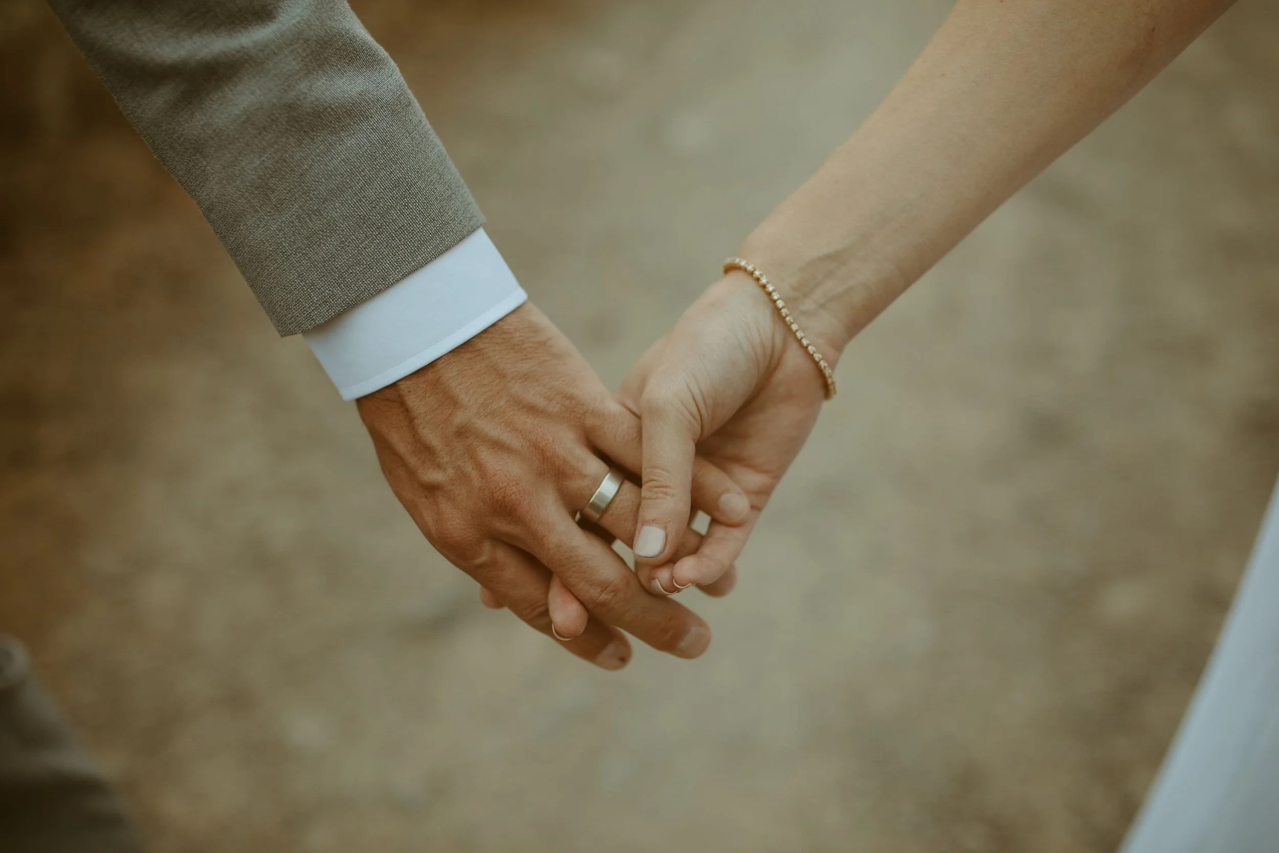 • Close-up of a couple holding hands, wearing wedding rings, with the man's hand on the left and the woman's hand on the right.